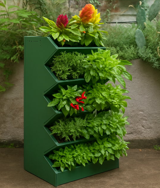 Hemos desarrollado un huerto vertical compacto y modular con un sistema de compostaje integrado, diseñado para espacios públicos y comunitarios, incluso en zonas con disponibilidad de superficie muy limitada.